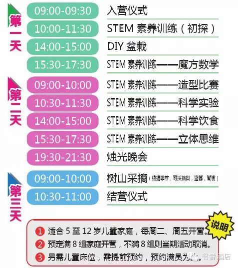包含项目:STEM素养营3天课程(共6课时)+雅致房1间两晚+两天营养双早+烛光晚会1场(免费会场使用)+免费饮料2瓶+免费采摘券2张(出园水果另外付费)+DIY盆栽1盆